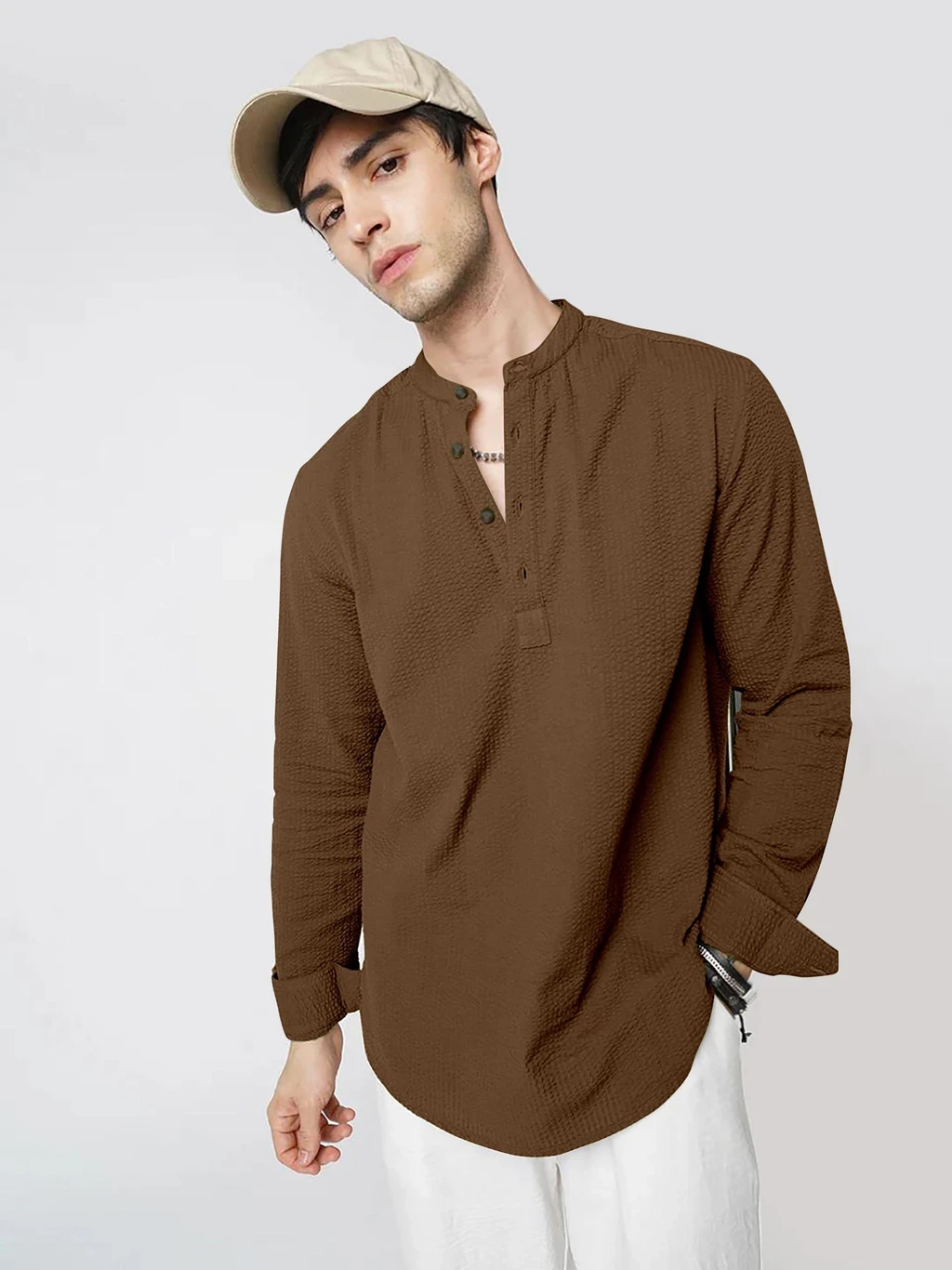 This men’s kurta style shirt features a smart mandarin collar with a minimal front button placket that creates a clean and contemporary ethnic-fusion look. The textured fabric finish adds depth and visual richness while maintaining a soft and comfortable feel for all-day wear. Designed in a regular fit with full sleeves and a straight hem, this shirt is suitable for everyday casual use, office wear, festive occasions and social gatherings. The versatile styling makes it easy to pair with trousers, jeans or traditional bottoms for a polished and confident appearance.